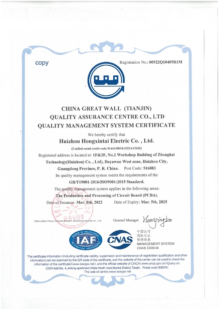 Xing Hong Tai assure une qualité supérieure grâce aux services de rayons X, AOI et TIC. Notre équipe suit les normes IPC-610 et J-STD-001 pour l'assemblage et l'inspection.Nous offrons des assemblages de PCB de haute qualité sans plomb avec des processus conformes à la ROHS.